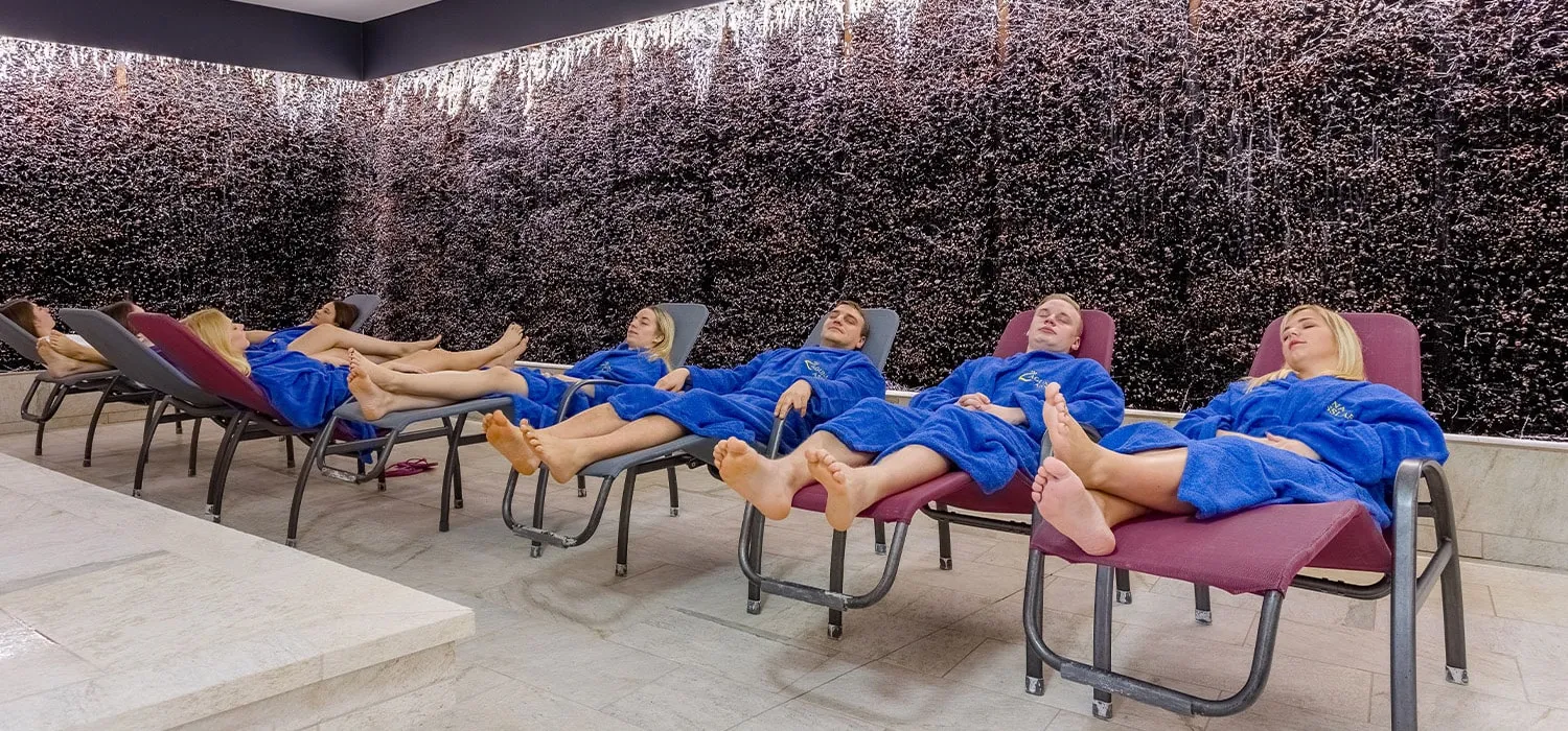 Die Salzsauna mit einer Raumtemperatur von maximal 70°C rundet unser Gesundheitsangebot mit dem Thema „Salz“ ab, da hier die Raumluft mit Salzpartikeln angereichert wird, sodass Beschwerden wie Hustenreiz oder Schwellungen gelindert werden. Für eine besonders ansprechende Atmosphäre sorgen die bunten Wände aus echtem Salzstein hinter den beiden Saunaöfen.